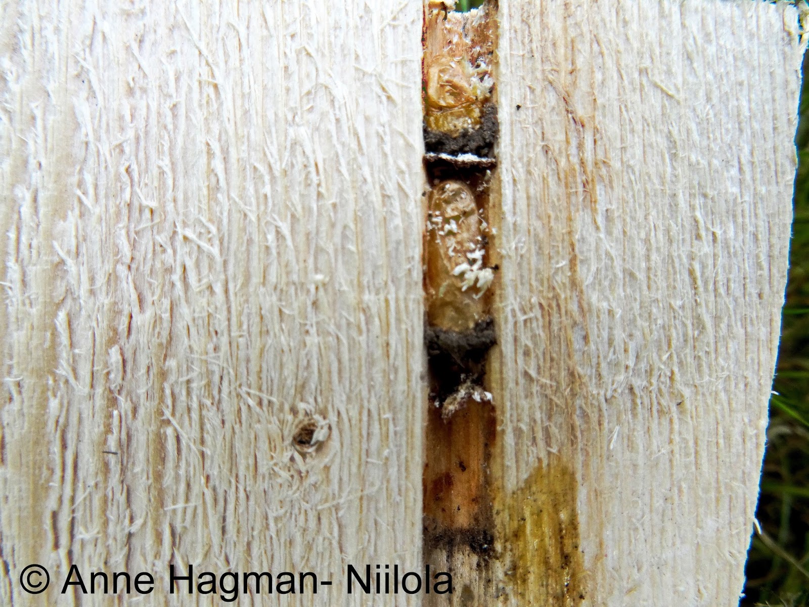 Puutarhassa olevat pörisijät munivat saman tien uusiin paikkoihin munia. Yläkuvassa on uuden räystäslaudan taakse ehditty laskea munat.